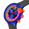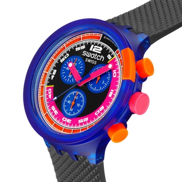 Quest’orologio extra-large s’ispira a uno Swatch CHRONO anni Novanta: il GRAND PRIX da collezione (SCJ101). Le sue caratteristiche principali includono un quadrante vivace e multicolore con indici delle ore e tacche dei minuti della lunetta interna al quadrante che si illuminano al buio e una scala tachimetrica, il tutto sotto un vetro biosourced. Anche la punta rosa delle lancette di ore e minuti e quella blu scuro delle lancette dei secondi del cronografo si illuminano al buio. La cassa trasparente biosourced color blu opaco ha una lunetta abbinata con dettagli arancioni opachi e pulsanti multicolore, Completano il modello un cinturino strutturato nero opaco trasparente con passanti trasparenti nero e blu opaco e una mezza fibbia blu opaco trasparente. Tutto è realizzato con materiale biosourced.