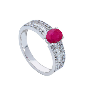 Anello in Oro Bianco 18kt con Rubino Naturale taglio Ovale e Diamanti taglio Baguette e taglio Brillante.