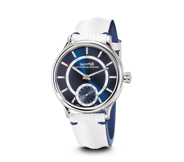 QUADRANTE BLU CON LAVORAZIONE “SOLEIL” CON INDICI APPLICATI, RODIATI, BOMBATI, SCAVATI CON SUPERLUMINOVA BIANCO. SCALA DEI MINUTI BIANCA CON LAVORAZIONE “AZURÉ”. CONTATORE DEI SECONDI BLU CON LAVORAZIONE “AZURÉ” E PROFILO BIANCO CON LAVORAZIONE “AZURÉ”.
