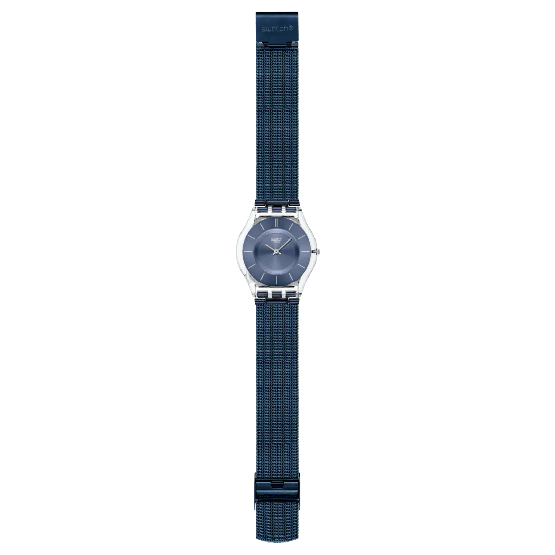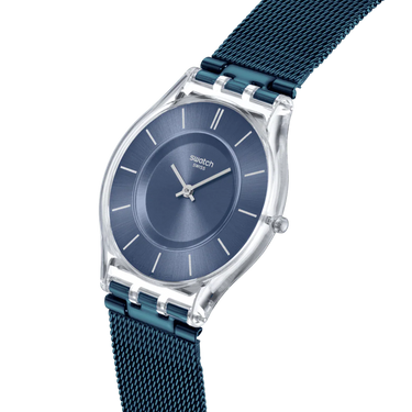 Questo orologio ultrasottile presenta un quadrante blu spazzolato soleil con indici color argento, lancette delle ore e dei minuti in una cassa biosourced trasparente lucida con vetro biosourced. Un bracciale regolabile in maglia di acciaio inossidabile con rivestimento in PVD blu completa il look di questo elegante modello.