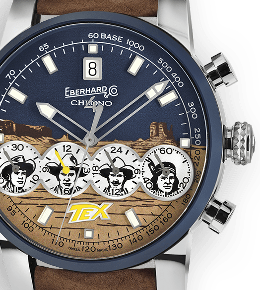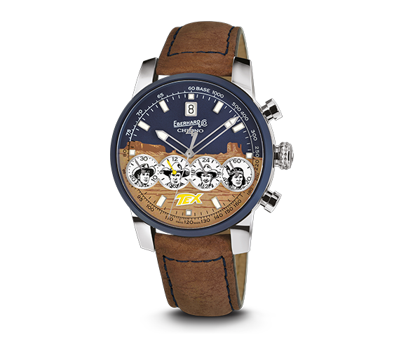QUADRANTE BLU CON PROFILO DEI DESERTI AMERICANI IN COLOR SABBIA, 4 CONTATORI BIANCHI CON PROFILO APPLIQUE LUCIDO PERSONALIZZATO CON I 4 PARDS. INDICI APPLICATI, SCAVATI E LUMINESCENTI. SCALA TACHIMETRICA SU BASE 1000.