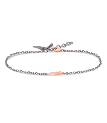 Bracciale da uomo in titanio e oro rosa 9 kt. Lo sviluppo del bracciale prende forma dall'elemento principale: un cornetto portafortuna in oro rosa 9 kt . Ai vertici del cornetto, due piccoli anellini fanno da supporto alla catenina che termina con un piccolo cornetto pendente in titanio. Il bracciale è regolabile da 18 a 21 cm per permettere il massimo confort e vestibilità. A garanzia del marchio MANO, sulla piccola targhetta vicino al moschettone, fa la sua comparsa il diamante black da 1 punto, simbolo inconfondibile del brand.