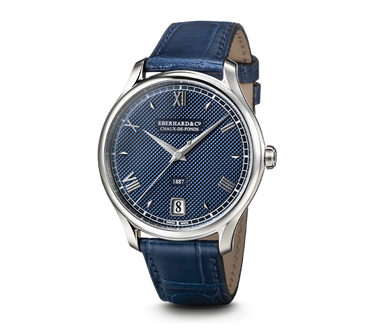 QUADRANTE BLU CON LAVORAZIONE “CLOUS DE PARIS”, PERSONALIZZATO CON IL LOGO STORICO “EBERHARD & CO. CHAUX-DE-FONDS” E DATA DI FONDAZIONE DELLA MAISON – 1887 – SU “CARTOUCHES” METALLICHE.