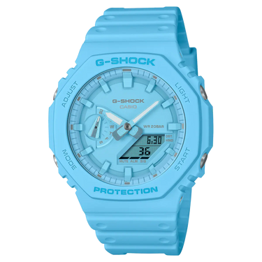 Dai il benvenuto alla serie G-SHOCK Tone-on-tone dallo stile monocromo con colori vivaci e brillanti. Il modello GA-2100 con la cassa ottagonale è reinterpretato in un design monocromatico disponibile in tre colori di tendenza: azzurro, bianco e lime.