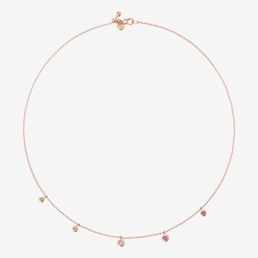 Collana Bollicine in oro rosa 9K con 1 tsavorite (ct 0.02), 1 topazio azzurro (ct 0.03), 1 zaffiro rosa (ct 0.08), 1 rubino (ct 0.06) e 1 ametista (ct 0.04).