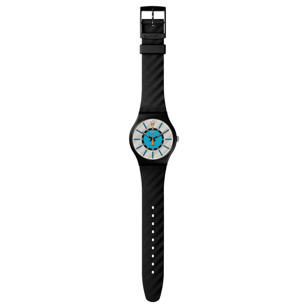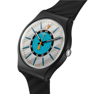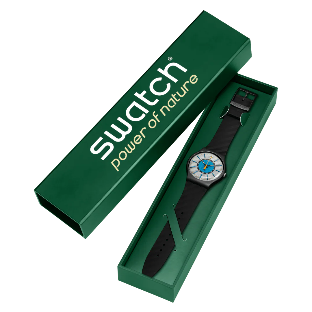 Questo orologio nero opaco presenta un quadrante argento, blu e nero con innovativi dettagli 3D e indici e lancette fosforescenti, il tutto protetto da una cassa BIOCERAMIC nera opaca con vetro biosourced. Il cinturino, il passante e la fibbia BIOCERAMIC, tutti in nero opaco, completano il look gorpcore dell' orologio.