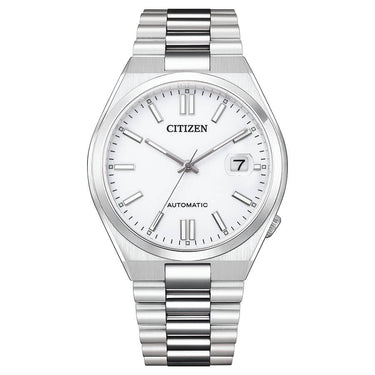 Orologio Citizen della collezione Tsuyosa quadrante Bianco e movimento meccanico a carica automatica Myota 8210 visibile dal fondello. Cassa da 40 mm e bracciale integrato in acciaio dal design molto lineare, vetro zaffiro con lente magnificatrice sul datario a ore 3, impermeabile a 5 bar. Orologio dal fascino retrò ideale per completare il tuo look elegante o casual.