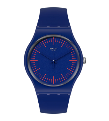 A prima vista, uno Swatch non è mai come sembra. La superficie opaca blu navy sportiva e senza tempo di BLUENRED (SUON146) è la copertura perfetta per lo strato interno rosso fuoco. Quando lo giri? SBALORDISCI! Preparati a sentire gli sguardi puntati verso di te.