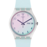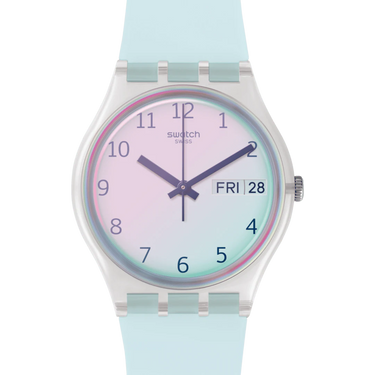 Con il celeste di ULTRACIEL (GE713), le nuvole sono solo un ricordo. La chiarissima tonalità di blu del cinturino è perfettamente abbinata al bianco del quadrante, ricoperto da un vetro Swatch Solar Spectrum azzurro.