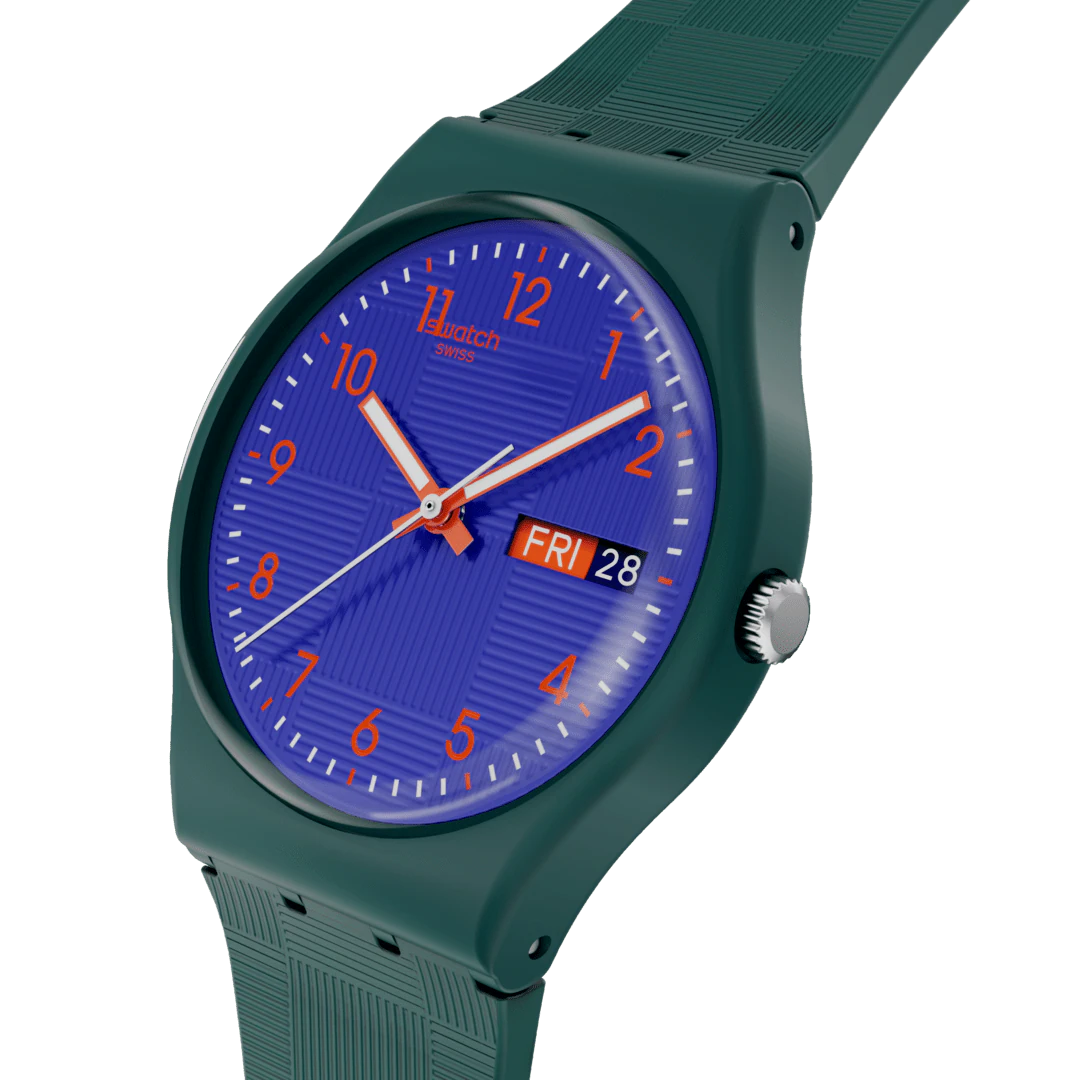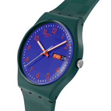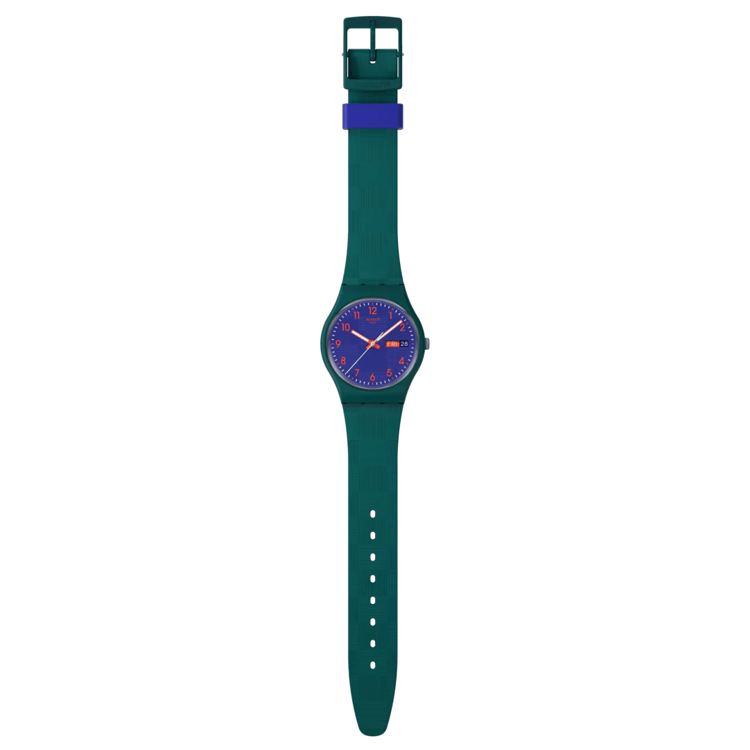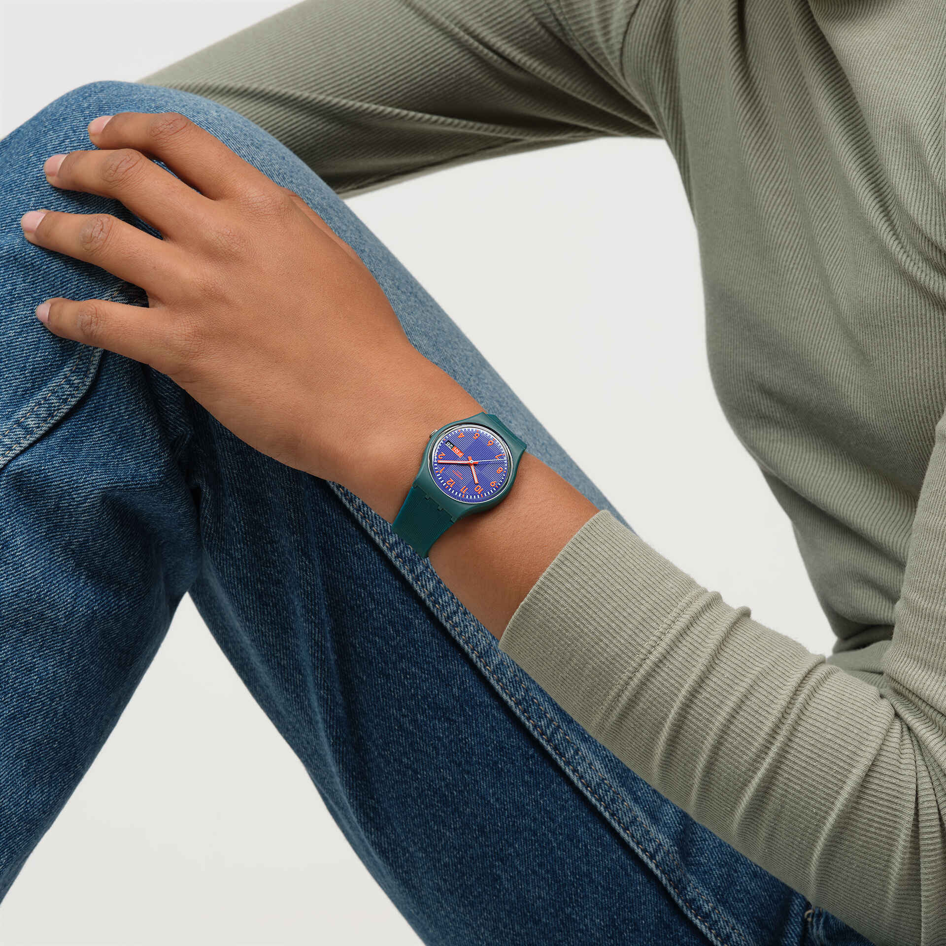 Questo orologio presenta un quadrante blu testurizzato con numeri stampati arancioni, tacche dei minuti stampate azzurre e arancioni e datario a ore 3. Sotto il vetro biosourced, l’orario è indicato da lancette delle ore e dei minuti arancioni che si illuminano al buio e da una lancetta dei secondi azzurra. La cassa in verde scuro opaco è completata da un cinturino verde scuro opaco testurizzato, da un passante blu opaco e da una fibbia di colore verde scuro opaco.
