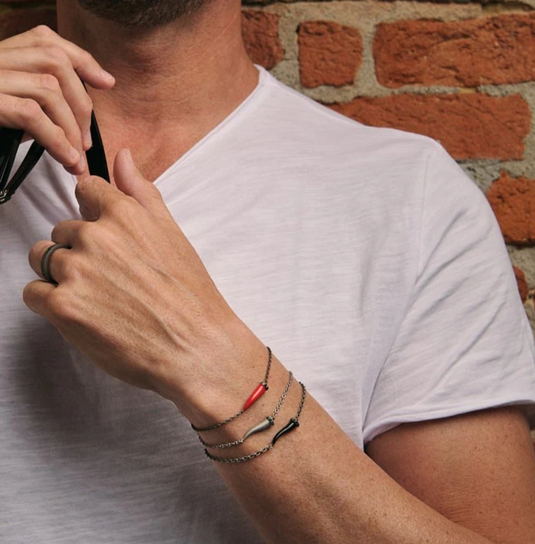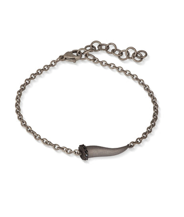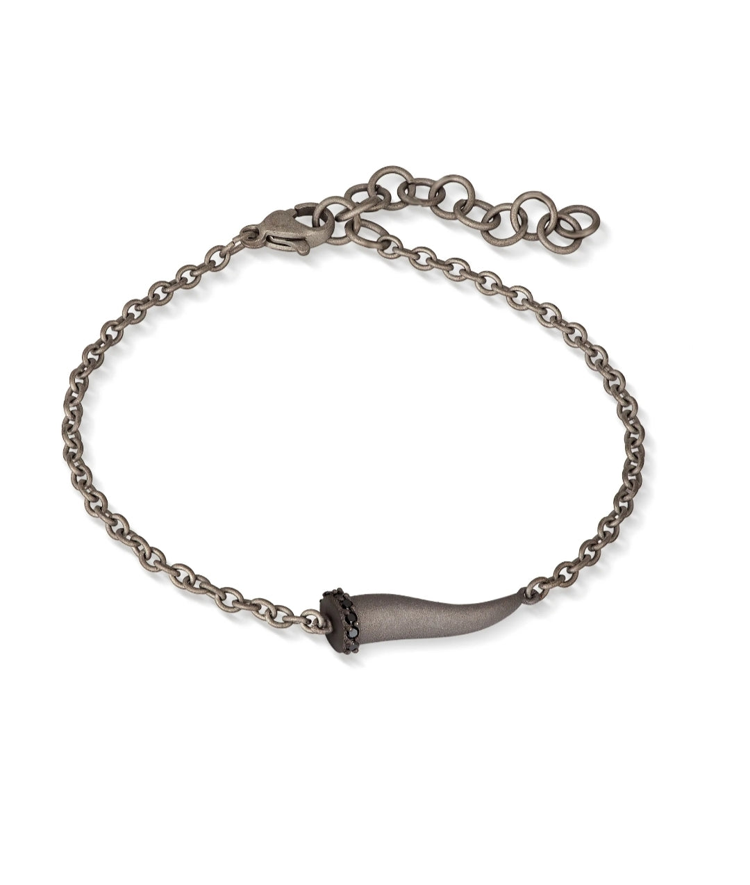 Bracciale da uomo in titanio e 5 diamanti black. Lo sviluppo del bracciale prende forma dall'elemento principale: un cornetto portafortuna in titanio. Attorno all'estremità più grande, sono incastonati 5 diamanti black per una caratura totale di 5 punti. Ai vertici del cornetto, due piccoli anellini fungono da supporto per la catena che termina con una serie di anellini permettendo così massima indossabilità per ogni polso.A garanzia del marchio MANO, sulla parte posteriore del cornetto, fa la sua comparsa il diamante black da 1 punto, simbolo inconfondibile del brand.