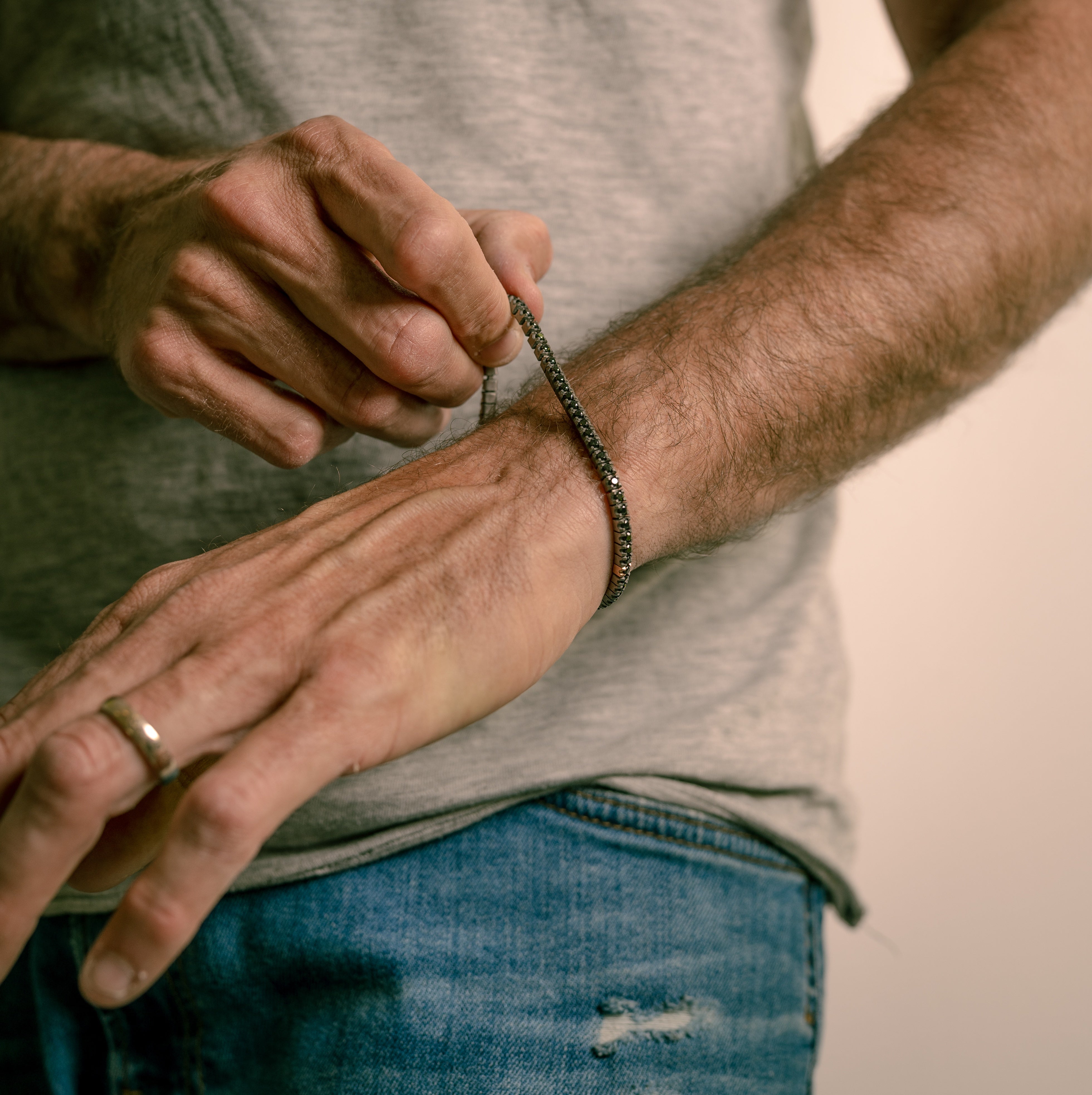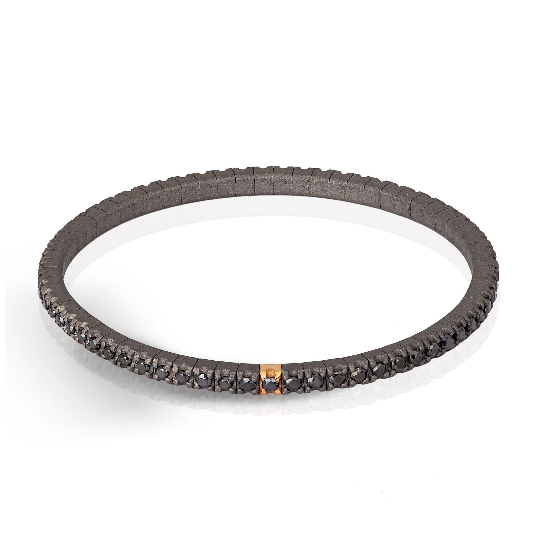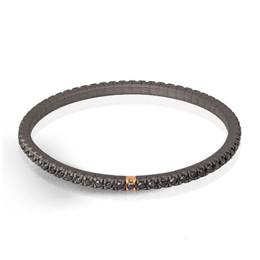 Bracciale uomo in titanio e diamanti black (ct. 2.00). La struttura è composta da una fila ininterrotta di diamanti da 3 punti incastonati su griffes in titanio e una in oro rosso da 18 Kt poste una accanto all'altra su una maglia elastica. In questo bracciale si racchiude l'idea del classico gioiello tennis con l'innovazione del materiale che lo rende leggero, sicuro e facile da indossare.