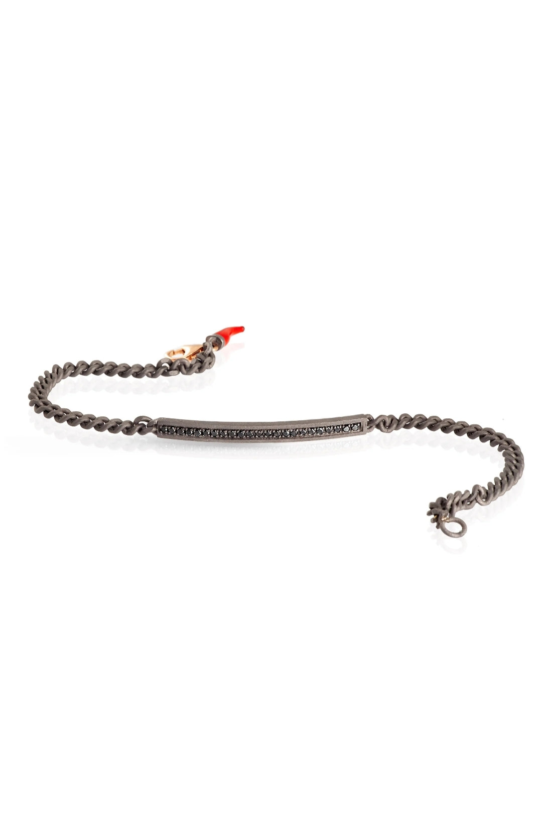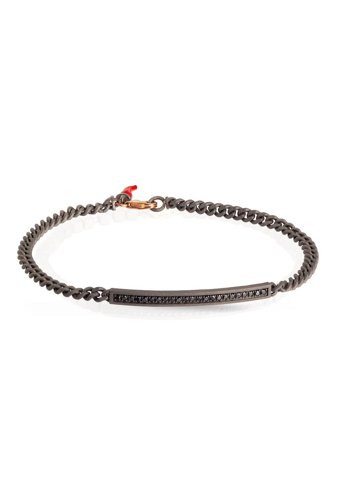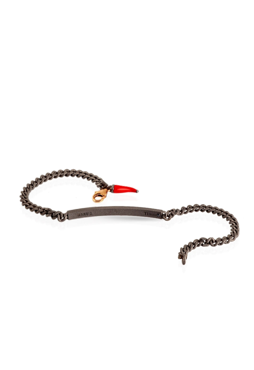 Bracciale uomo in titanio, diamanti black e chiusura in oro rosso 9 kt. Una barretta in titanio, sulla quale sono incastonati 23 diamanti black da 1 punto per una caratura totale di 23 punti, è l'elemento principale del bracciale. Ai lati della barretta, leggermente ricurva, si collega un'elegante catena groumette che termina con una preziosa chiusura a gancio in oro rosso 9 kt. Alla chiusura in oro rosso si trova l'affascinante charms pendente rosso. Il marchio MANO|J., impresso al laser sulla parte inferiore della barretta, è accompagnato dall'immancabile diamante black da 1 punto testimonial del brand.Un comodo e prezioso bracciale che per leggerezza e manifattura, permette massimo comfort e adattabilità ad ogni polso..