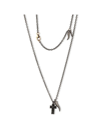 Collana da uomo in titanio con cornetto e croce pendenti. Al centro, la protagonista è la croce incassata con sette diamanti neri da tre punti l’uno affiancata da un cornetto in titanio, che scorrono attraverso una resistente ma leggera catenina dello stesso materiale. La collana termina con un anellino in oro rosso 9 kt e una chiusura a gancio in oro rosso 9 kt che donano un tocco di preziosità al gioiello. Facilmente indossabile e adattabile ad ogni vestibilità grazie alla possibilità di regolare la catena da 50 a 55 cm. Il simbolo del marchio MANO|J, il diamante black da un punto e l’incisione del brand, si trovano su una piccola targhetta posta vicino al moschettone.