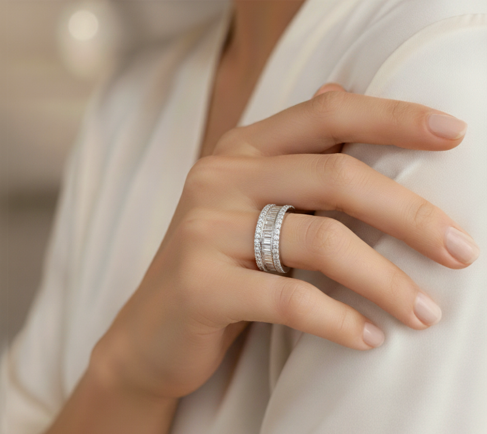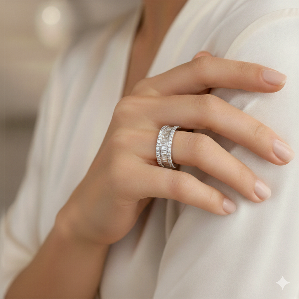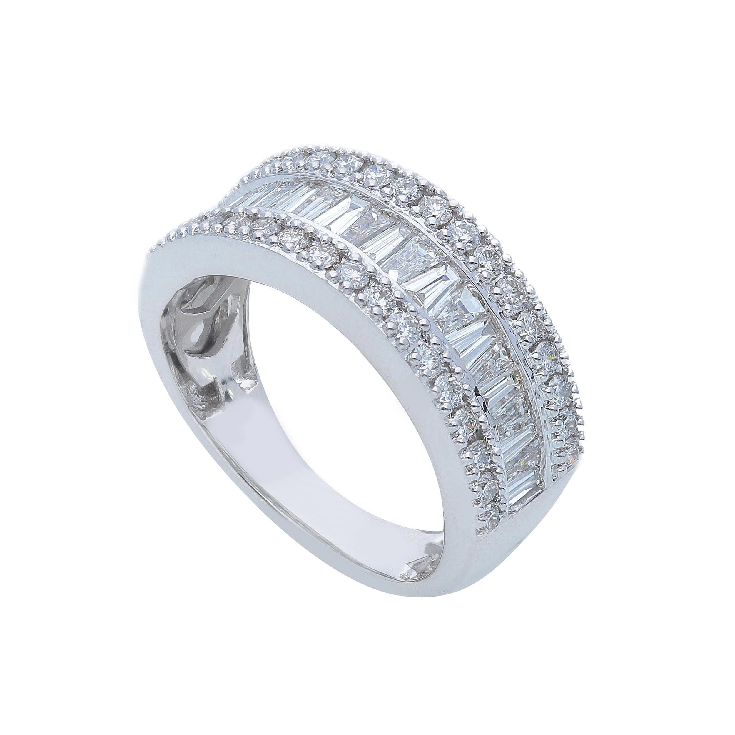 •Anello a fascia mezza vera in oro bianchi con diamanti tagli brillanti e tagli baguette