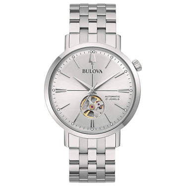 Orologio Bulova della collezione Aerojet nella colorazione Silver con cinturino in acciaio. L'orologio è dotato di Movimento meccanico a carica automatica Bulova con oblò trasparente con movimento a vista. Vetro minerale, cassa e cinturino in acciaio.