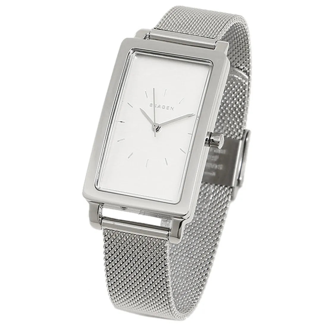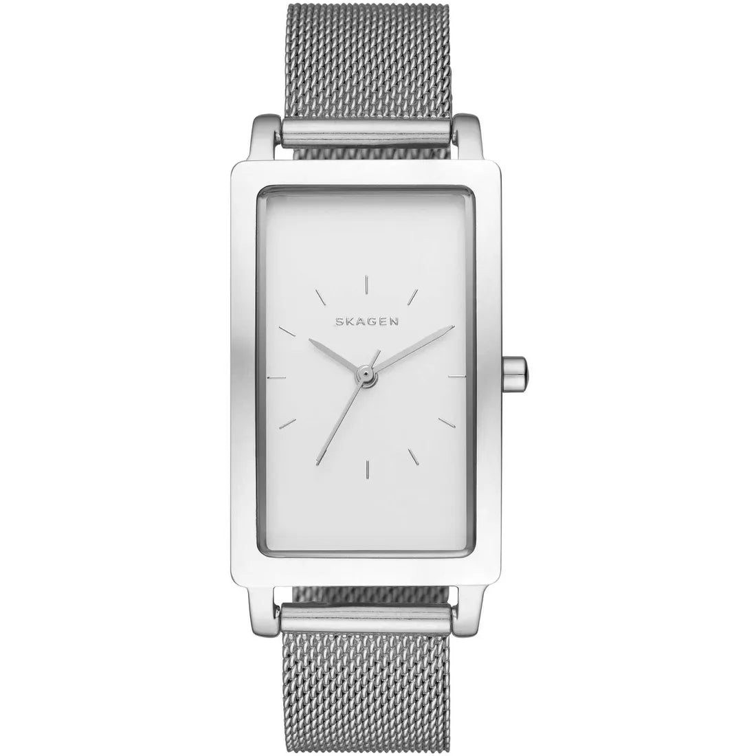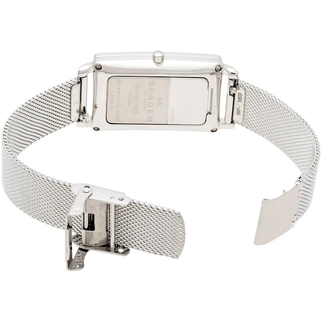 Orologio donna Skagen collezione Hagen elegante e raffinato ha una cassa rettangolare in acciaio lucido con bracciale maglia Milano.